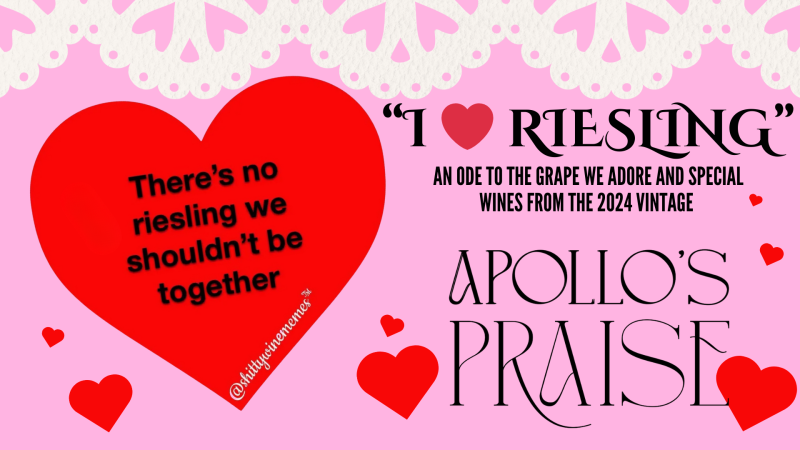 A special guided tasting of 2024 vintage Rieslings from Apollo’s Praise, including the extremely limited Noble Dry and Noble Select late harvest wines from the Knoll. We’ll taste six wines, geek out about Riesling, and learn about the 2024 vintage at Lahoma. Riesling Valentines from the one and only @shittywinememes included in your ticket, because there’s no reason we shouldn’t be together at the Apollo’s Praise Farmhouse drinking Riesling!