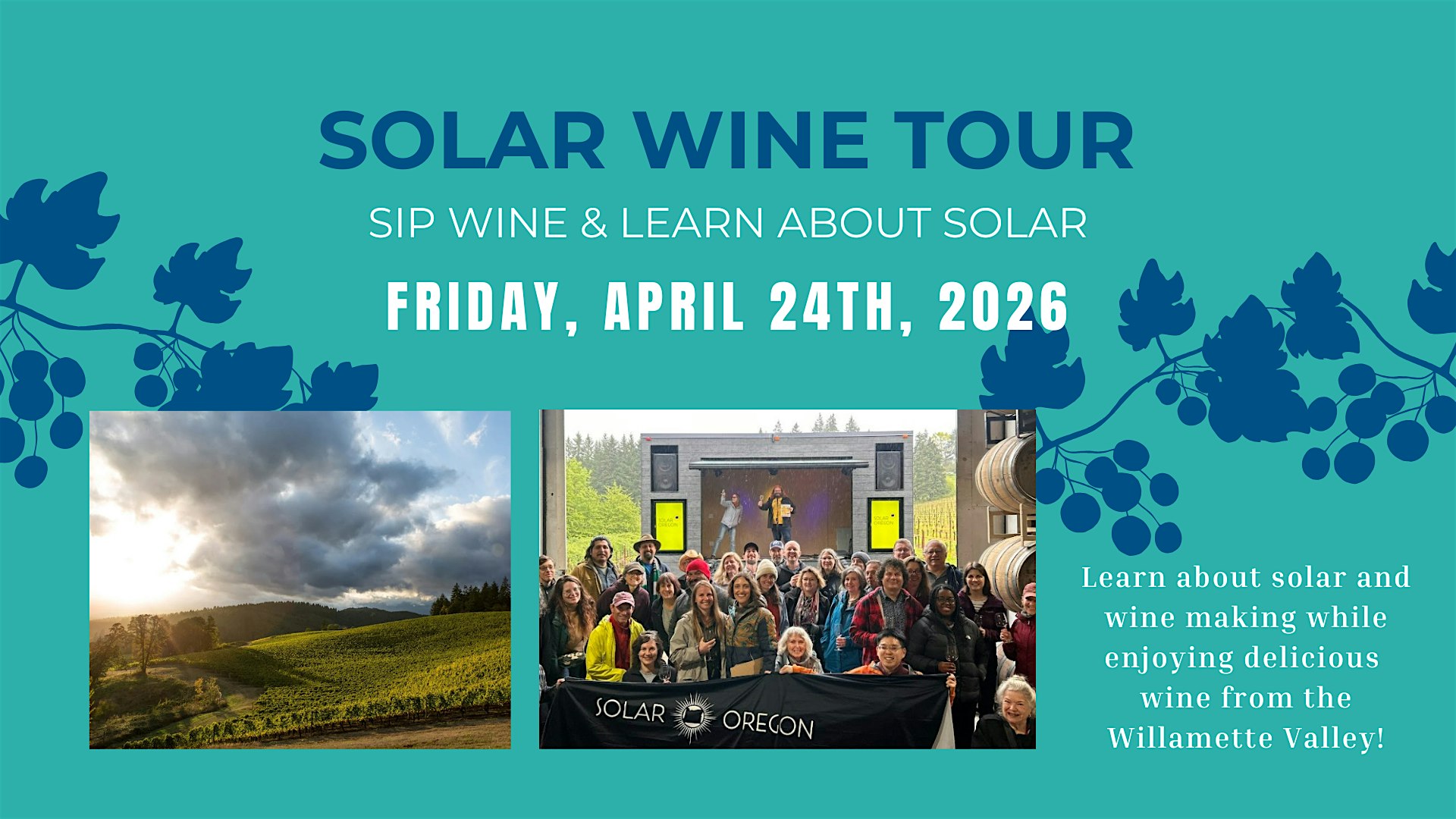 The 14 th Annual Solar Wine Sun-Lite Tour by Solar Oregon will be on Friday April 24 th this year! We are simplifying and changing it up a bit this year. There will be solar information, solar systems to learn about, and wine tasting to be enjoyed, all in support of Solar Oregon! This year it is a self-guided tour, hosted by three amazing Oregon wineries.
