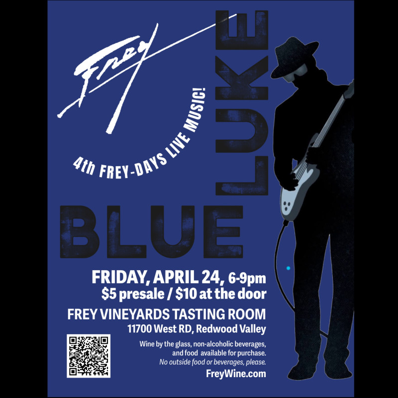 Come enjoy our 4th Frey-Days concert series with creative, energetic guitarist Blue Luke, and friends. Music begins at 6:00pm at the Frey Vineyards Tasting Room, 11700 West RD, Redwood Valley. Multi-generational fun encouraged with Foosball, ping-pong, and board games! Wine by the glass for 21+, non-alcoholic beverages, and Falafeel’s Good food tent available for purchase. No outside food or beverages, please.