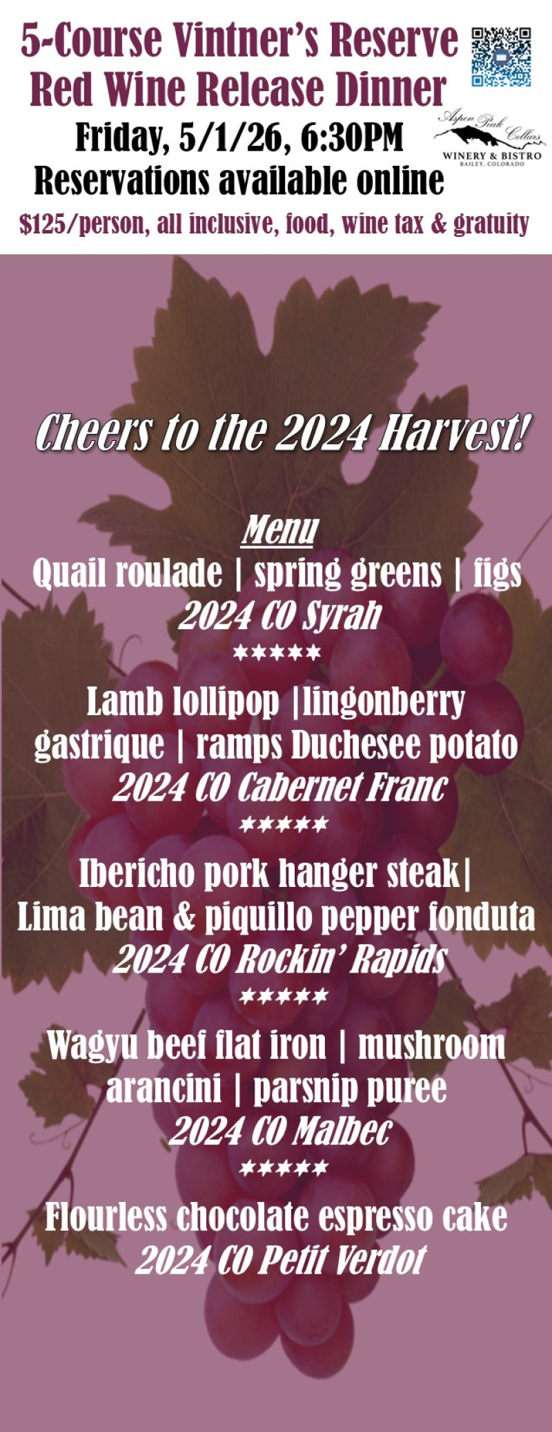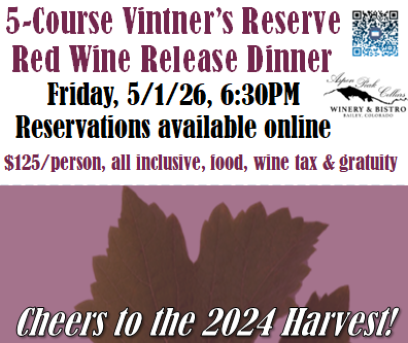 We are very excited to show off our new lineup of 2024 Vintner's Reserve red wines. Join us for an evening to celebrate this vintage perfectly paired with a mouthwatering 5-course meal. Any of those wines will be available to all attendees at 20% discount at the end of the night. All wines are created with 100% Colorado grapes. Please no substitutions. All ticket sales are final and non-refundable, but transferable to another party.
