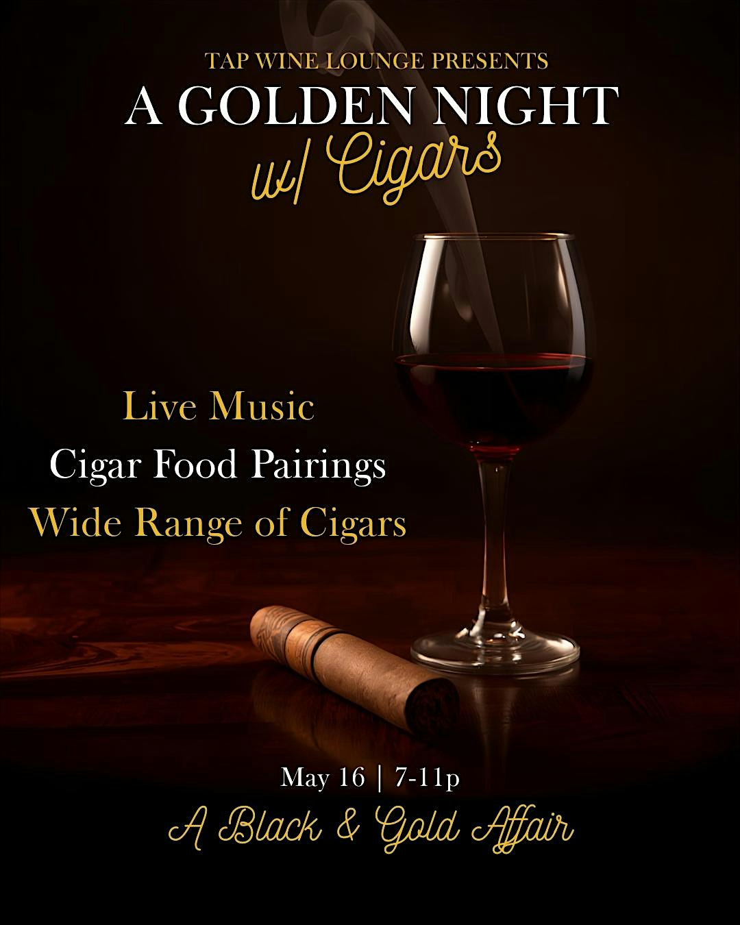Join us for a relaxed evening at TAP Wine Lounge on May 16, 2026 at 7:00 PM . Enjoy great company, smooth cigars, amazing food pairings and live music perfect for unwinding after a long day. Whether you're a cigar aficionado or just looking to hang out, this night is all about good times and good smoke paired with boutique Don’t miss out on this golden night experience!