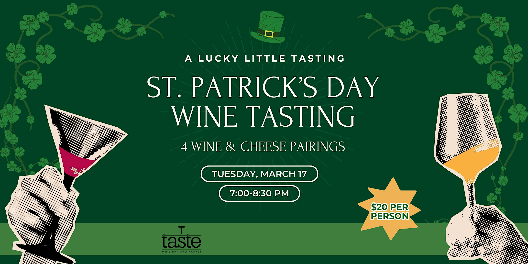 Celebrate St. Patrick’s Day with a cozy, elevated tasting experience at Taste Wine Bar. Join us for an evening featuring four thoughtfully selected wines paired with artisanal cheeses.