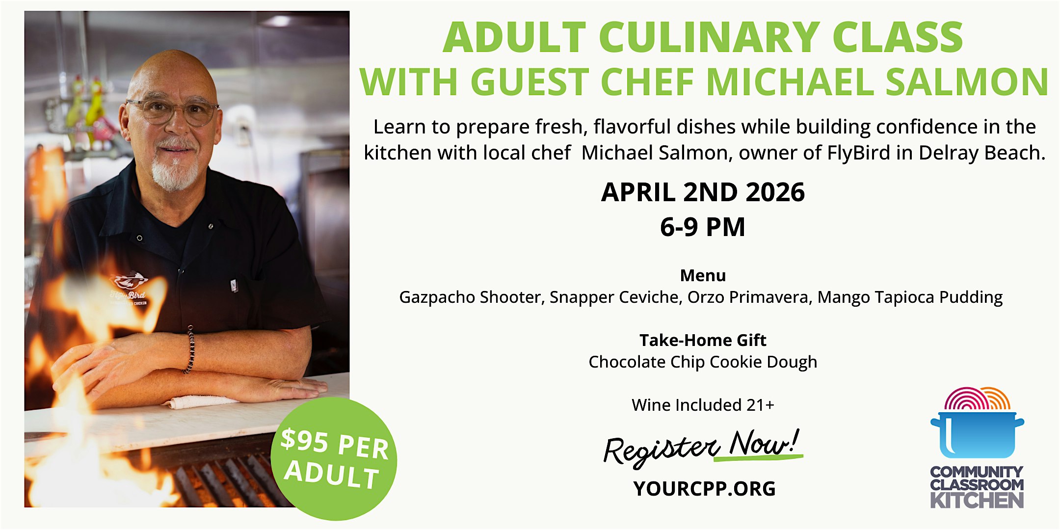 Join us for a special hands-on cooking experience with guest chef Michael Salmon, owner of FlyBird in Delray Beach. Known for his bold flavors and fresh ingredients, Chef Michael will guide participants through a thoughtfully curated and delicious menu designed to inspire confidence in the kitchen.