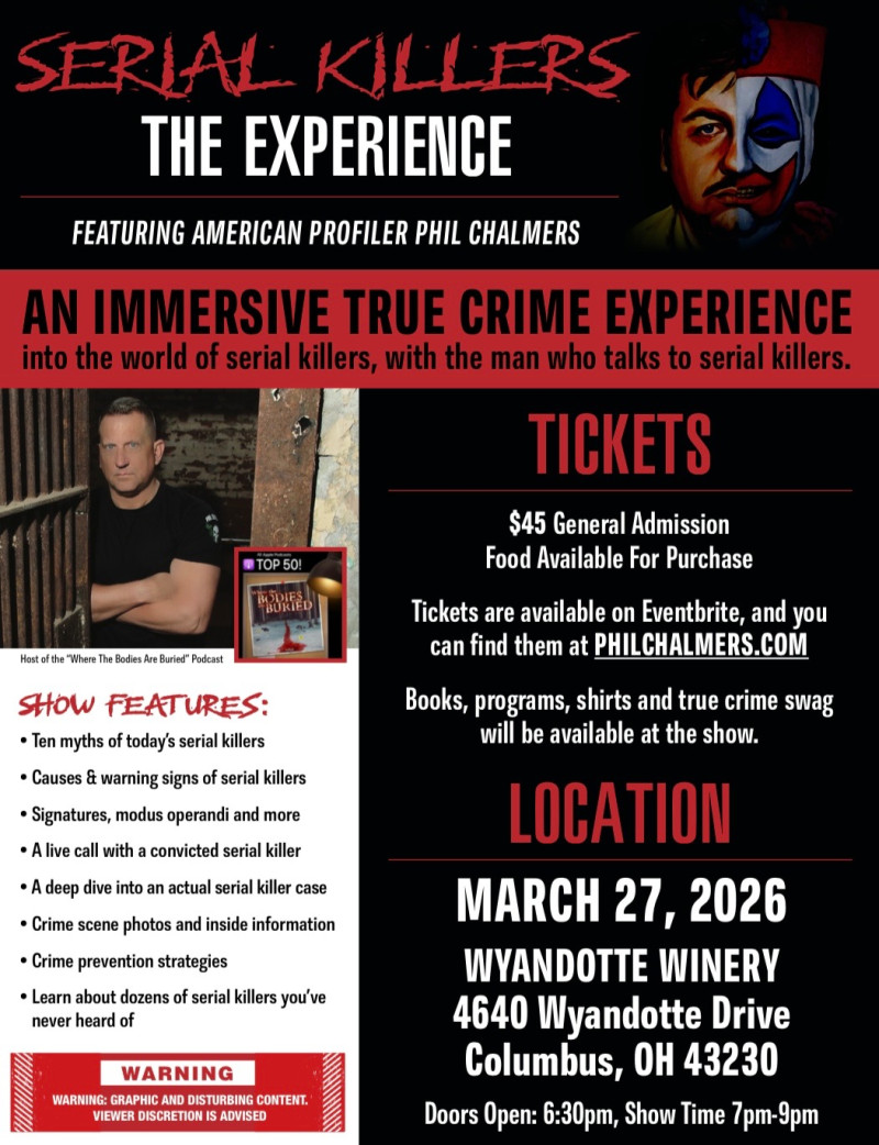 Join true crime expert Phil Chalmers for an immersive and thought-provoking presentation exploring the psychology of serial killers through real cases and collected artifacts. Guests are encouraged to arrive early to enjoy wine, pizza, and small plates before the theater-style show begins.