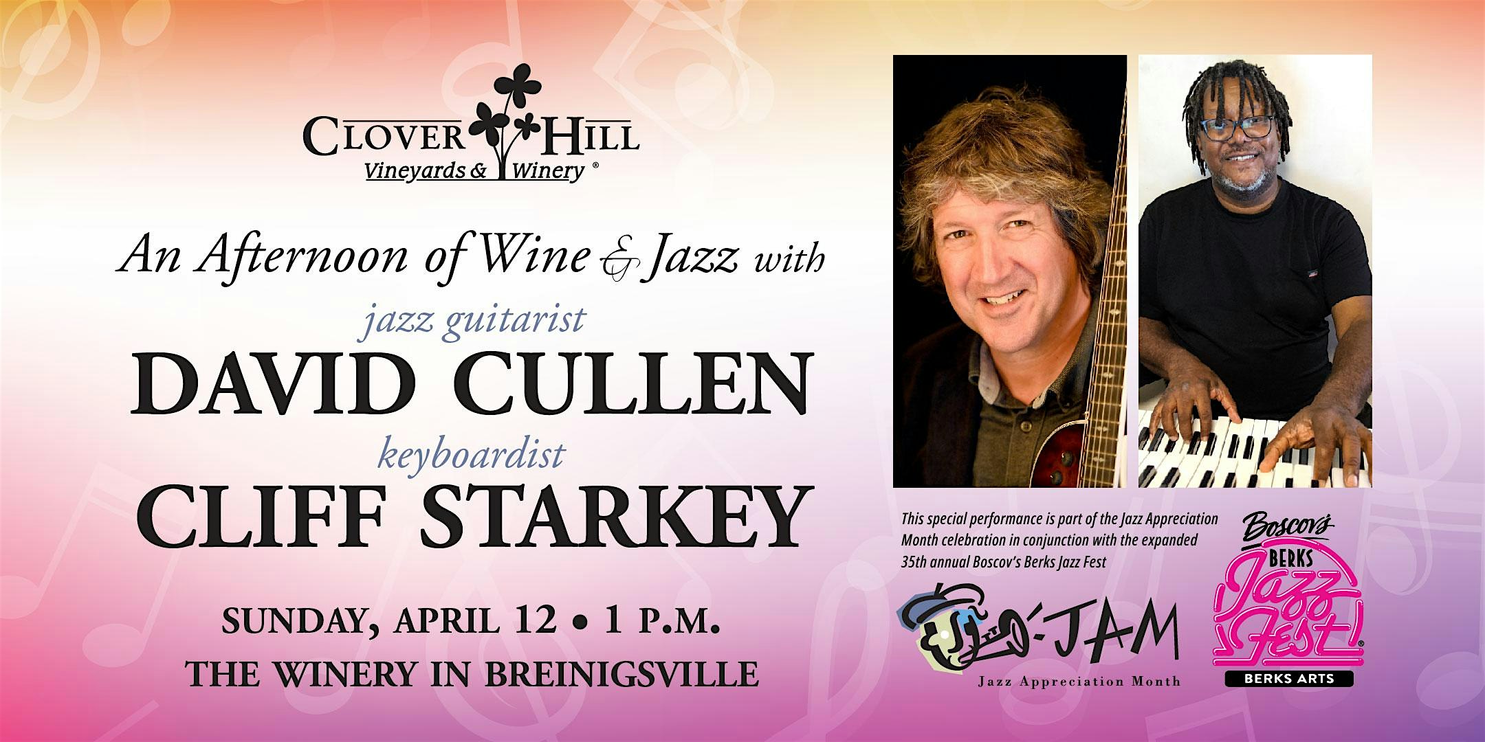 Clover Hill Vineyards & Winery is thrilled to welcome jazz guitarist David Cullen and keyboardist Cliff Starkey to the Breinigsville tasting room during the Jazz Appreciation Month celebration in conjunction with the expanded 35th annual Boscov’s Berks Jazz Fest.