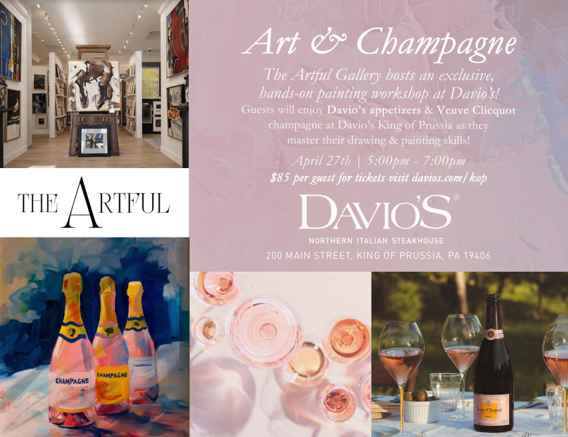 Join Davio’s Northern Italian Steakhouse, located in Town Center, for an exclusive workshop on Monday, April 27th at 5 PM. Guests are invited to enjoy chef selected appetizers (listed below) as well as a Veuve Clicquot Champagne tasting and master your freehand drawing and painting skills during a hands-on workshop led by The Artful Gallery.