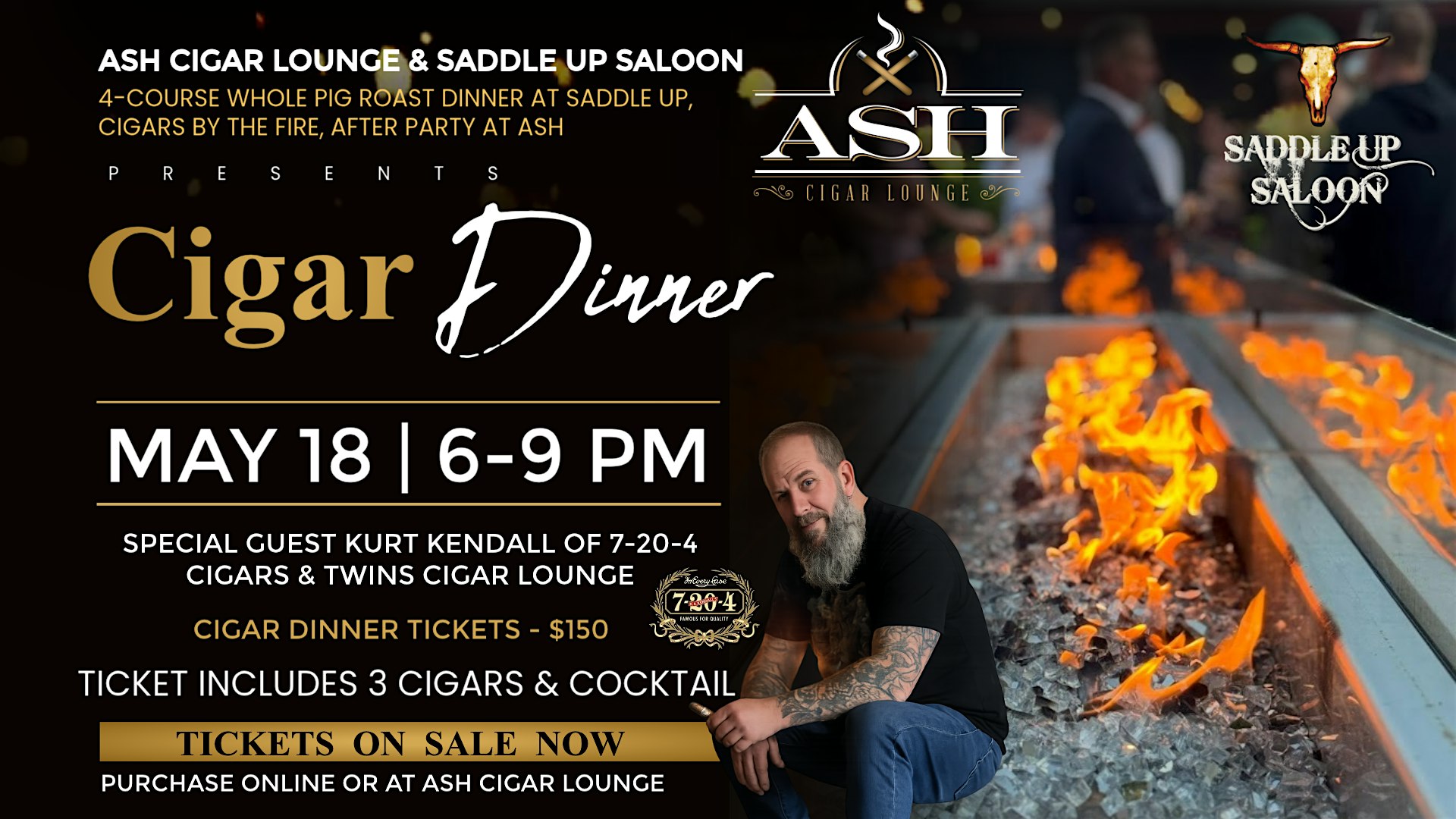 This edition of our Ash Cigar Dinner will feature special guest Kurt Kendall, owner of Twin’s Cigar Lounge and 7-20-4 Cigars. Guests will enjoy a full dinner from Executive Chef Sacha, three premium 7-20-4 cigars, one craft cocktail, and a relaxed night that starts at Saddle Up and finishes at Ash.