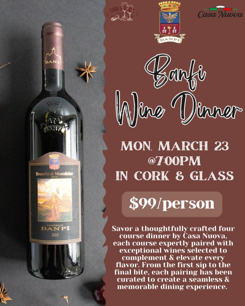 Indulge in a luxurious four-course dining experience with Lee McDaniel, where every course is perfectly paired with renowned Banfi wines. Each pairing is designed to highlight the flavors of both the food and the wine, creating a night of delicious harmony and memorable moments.