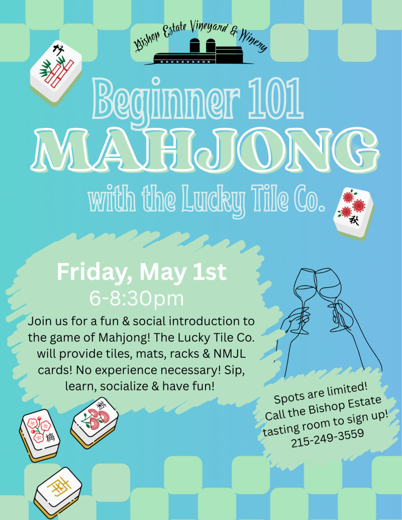 Join us for a fun & social introduction to the game of Mahjong! The Lucky Tile Co. will provide tiles, mats, racks & NMJL cards! No experience necessary! Sip, learn, socialize & have fun!