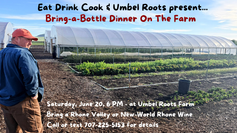 Eat Drink Cook and Umbel Roots Farm present a bring-a-bottle wine dinner AT Umbel Roots where we will dine on food from the farm surrounding us.