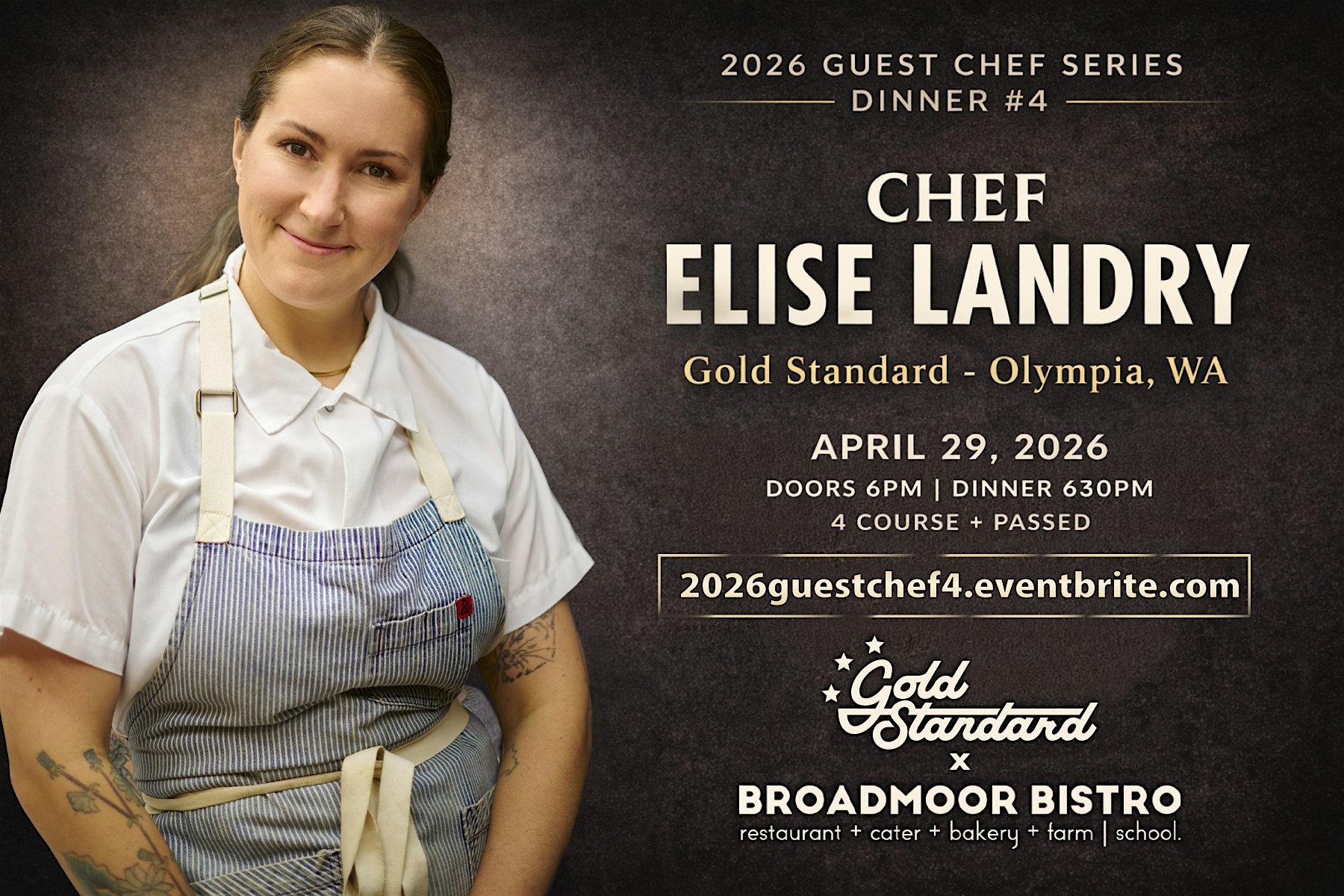 About Chef Elise LandryElise Landry is the chef and co-owner of Gold Standard in Olympia, Washington. A 2010 Broadmoor Bistro graduate, she has spent the past 17 years working across multiple roles in the culinary industry, including baker, pastry chef, butcher, and line cook.