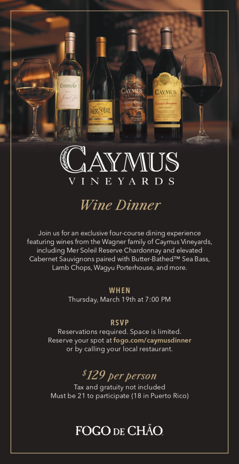 Join us for an exclusive four-course dining experience featuring Caymus Vineyards of Napa Valley. Enjoy the bright Mer Soleil Reserve Chardonnay alongside elevated Cabernet Sauvignons—perfectly paired with Butter-Bathed Sea Bass, Lamb Chops, Wagyu Porterhouse, and more.