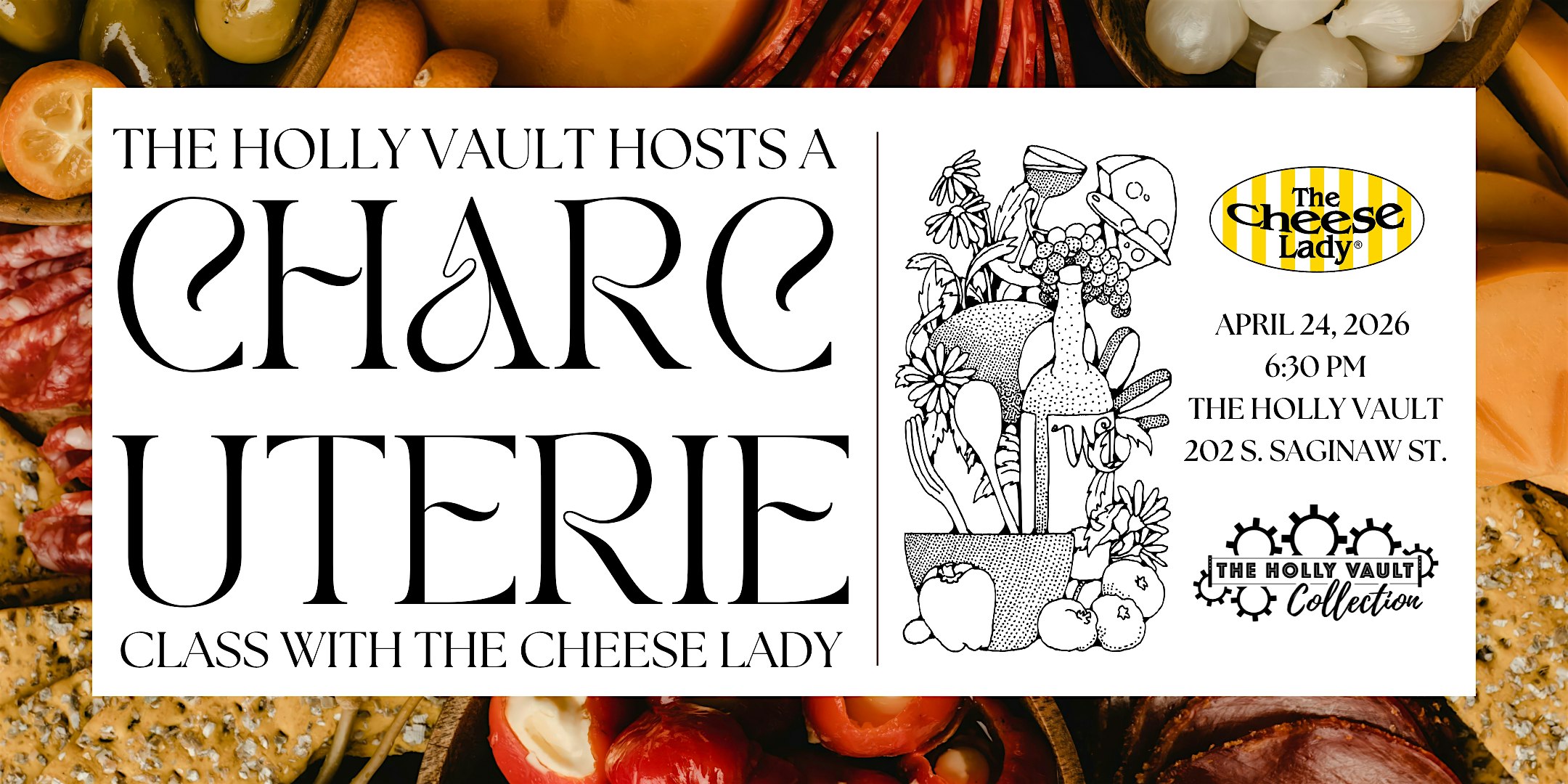 Indulge in an evening of artisanal delights at The Holly Vault! Join us on April 24th at 6:30 pm for a Spring Charcuterie Class with the Cheese Lady. Craft your own stunning cheese board under expert guidance and take it home to share with friends or family (feeds 6-8 people). The cost of this class includes the wooden charcuterie board, so take it home and keep practicing your craft!
