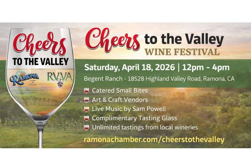 Raise a glass and cheers to the Ramona Valley! The annual Cheers to the Valley Wine Festival being held on Saturday, April 18, 2026 from 12pm – 4pm features wineries from the Ramona Valley and their award-winning top wines.