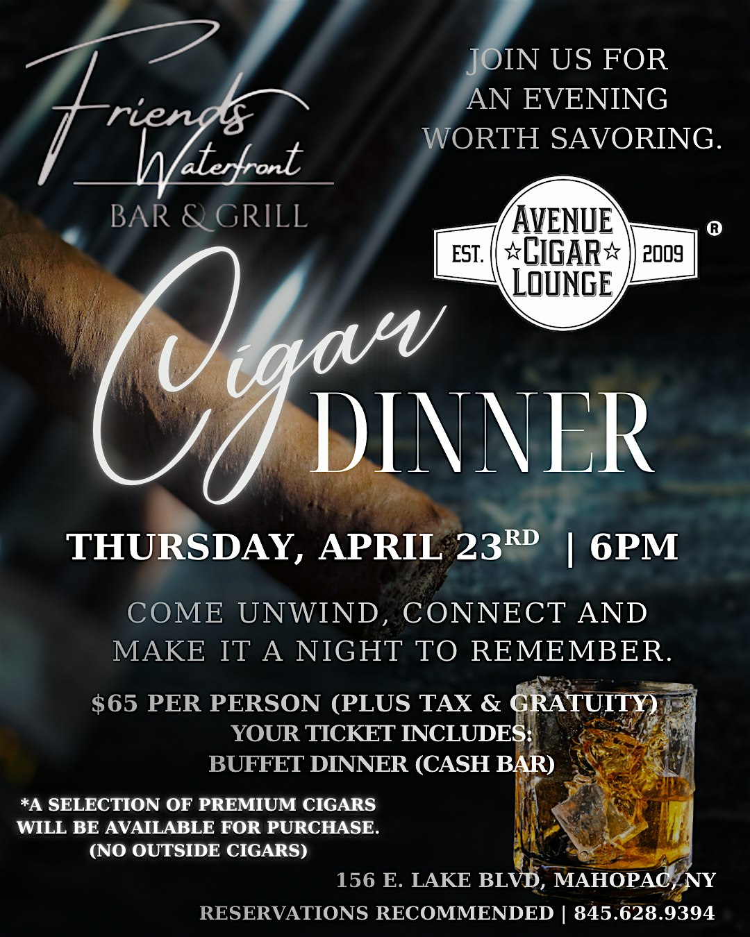 Get ready for an unforgettable evening at our Cigar Dinner! Join us in person to enjoy great company, delicious food, and of course, some hand-rolled cigars. Whether you’re a cigar aficionado or just looking for a chill night out, this event is perfect for kicking back, savoring the moment, and making new friends. Don’t miss out on the fun — come light up your night with us!