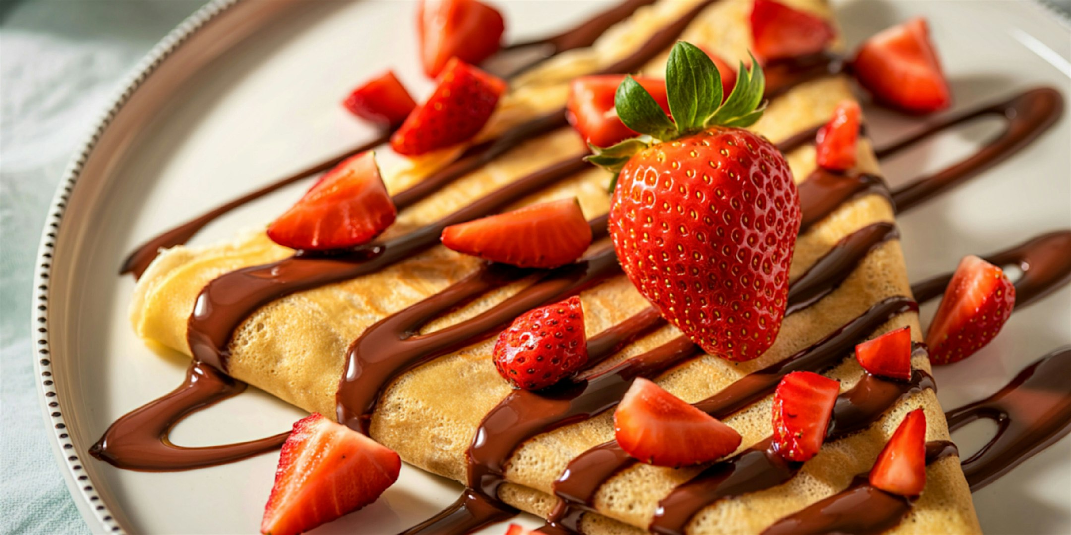 Light French crepes filled with sweet strawberries and chocolate for a perfect dessert.