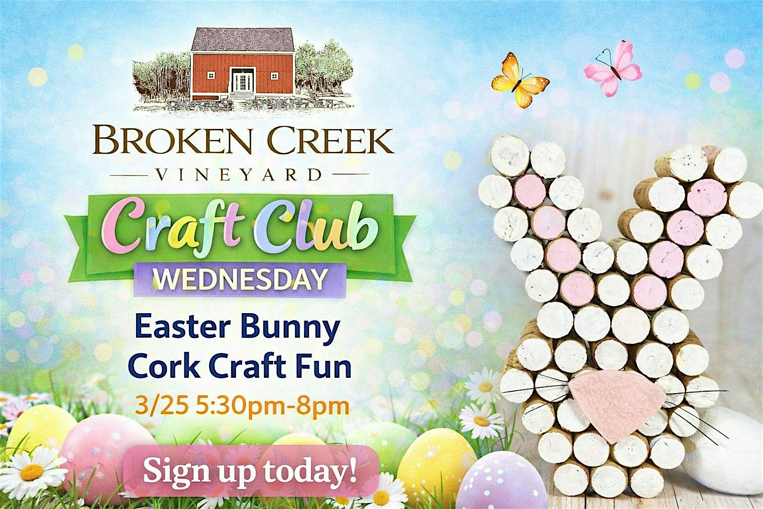 Hop into a creative night out at Broken Creek Vineyard! Join us for our Easter-themed Craft Club where you’ll create an adorable Easter bunny using wine corks while sipping on your favorite wines. It’s the perfect mix of crafting, laughs, and wine-filled fun!