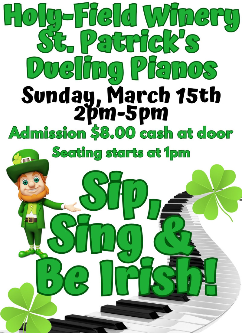 Sips, Songs and Shenanigans...Double the Pianos, Double the fun! Dennis & Tony go head to head on the keys, taking your requests and fueling a fun melodic showdown at Holy-Field Winery. You won't want to miss a single beat of the hilarity, musicality and fun.