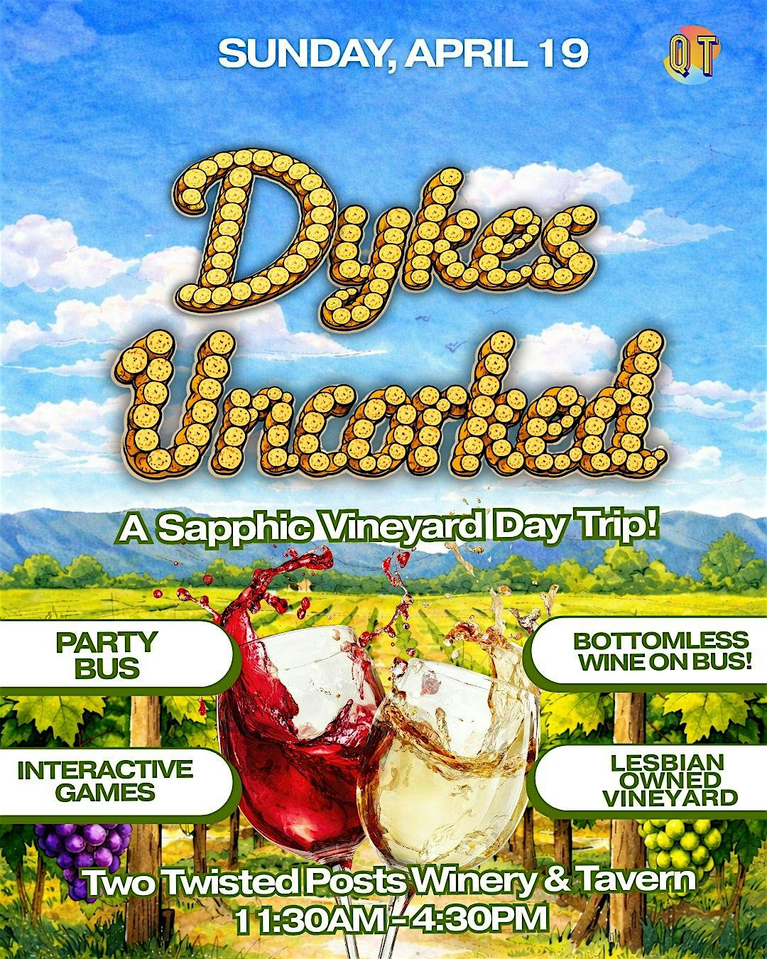 Dykes! Ever dreamed of going to a vineyard in the area with other sapphics? Did you know there is a Lesbian co-owned Winery and vineyard in Virginia? Welp, we are bringing you the chance to go to the Lesbian owned Two Twisted Posts Winery with other sapphics!