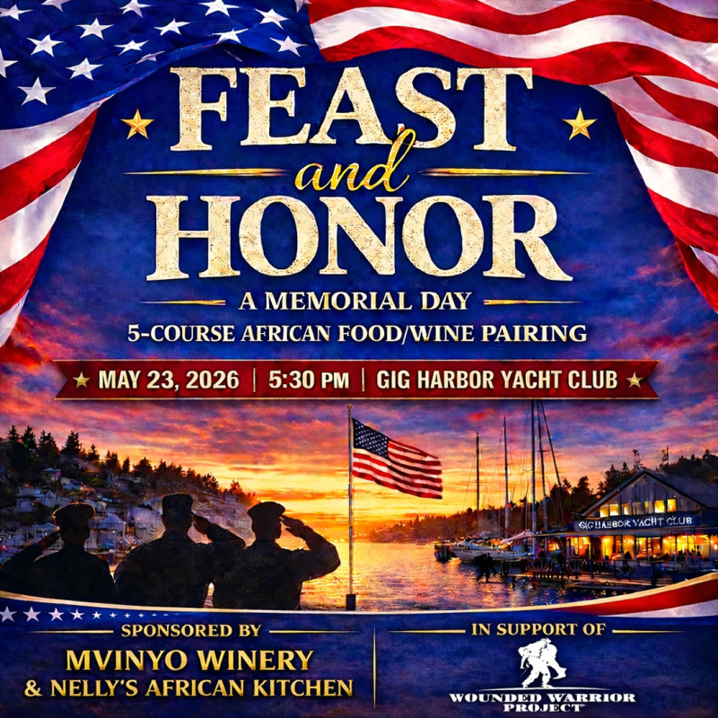 Join Mvinyo Winery and Nelly's African Kitchen for a Memorial Day Feast honoring our Veteran Heroes!! Truly a night to remember with an extraordinary 5-Course African Food and Wine Pairing!