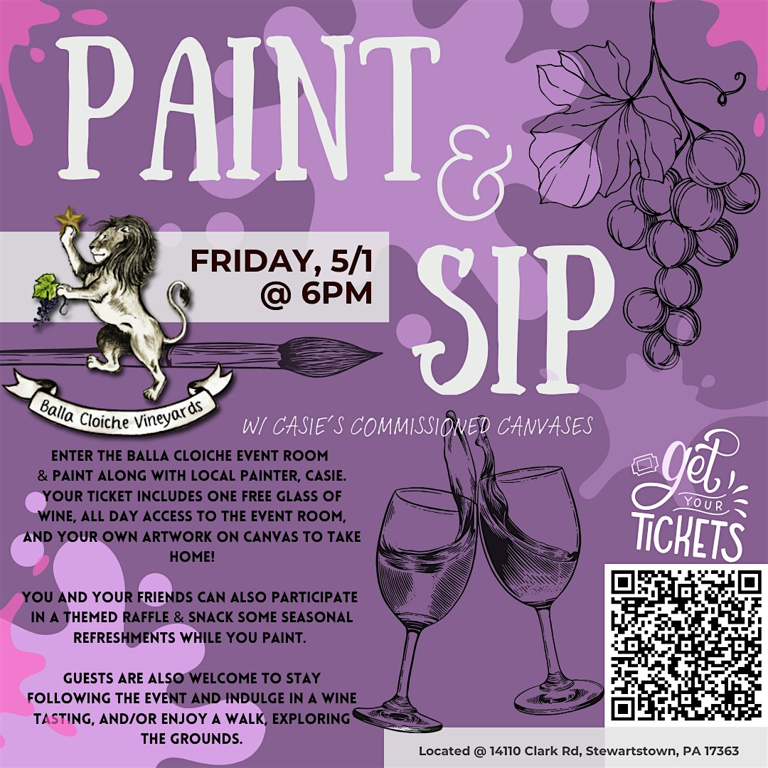 Join Local Artist, Casie w/ Casie's Commissioned Canvases for our next Paint & Sip @ Balla Cloiche Vineyards - - BUT, this time, we are hanging out on a FRIDAY NIGHT!