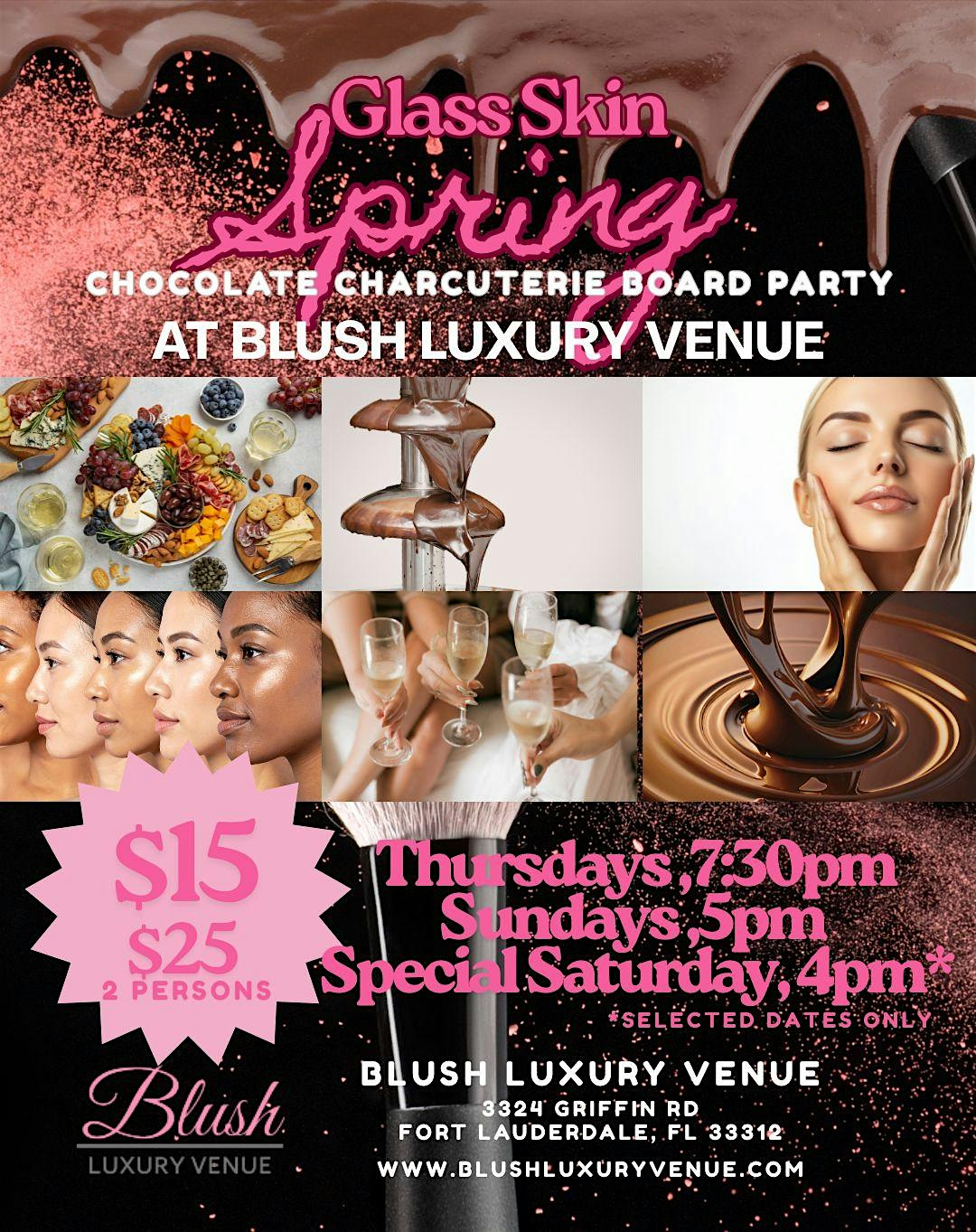 Join us at Blush Luxury Venue for our seasonal glow-up experience — the Glass Skin Facial Spring Chocolate Charcuterie Party