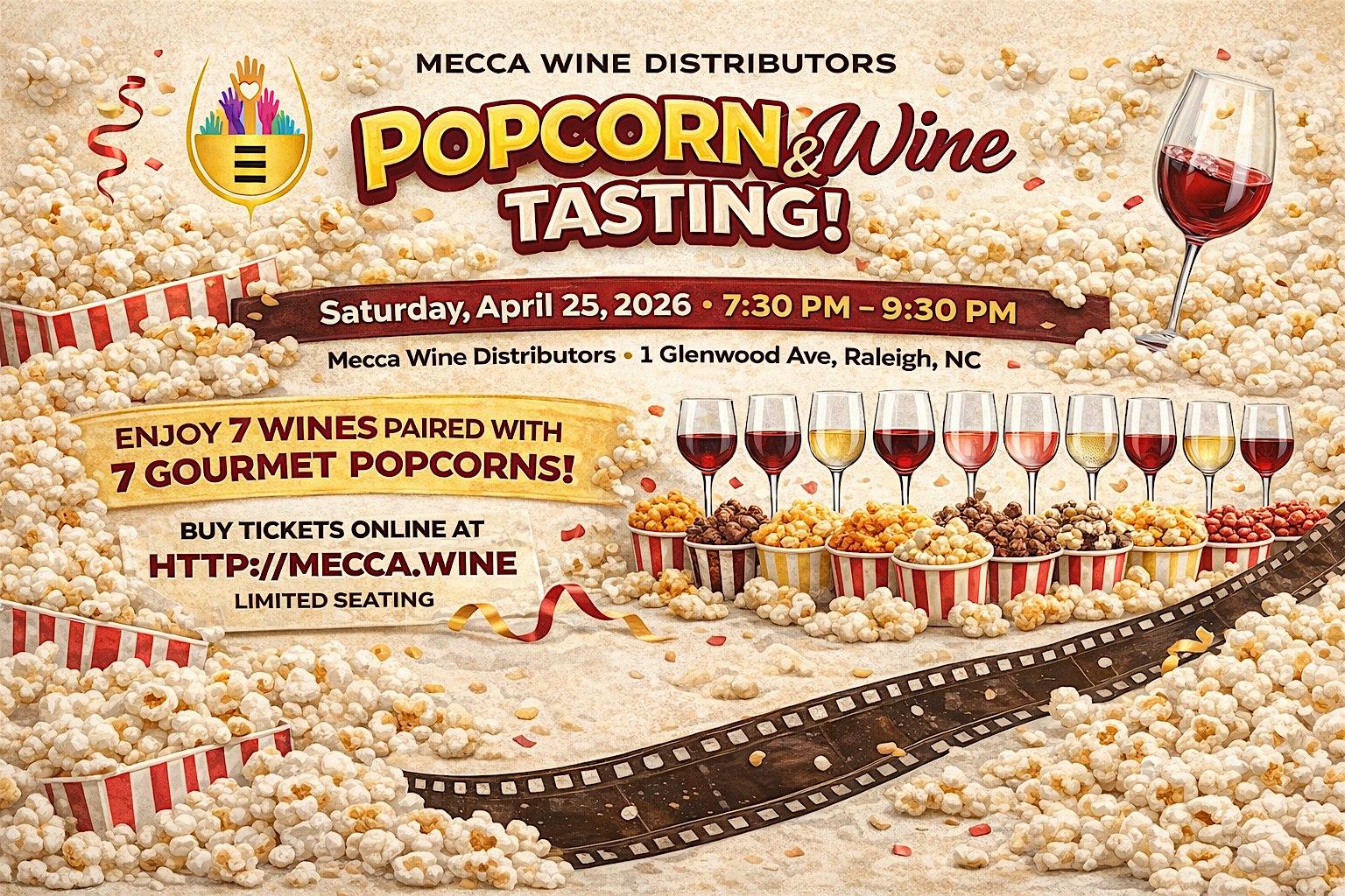 Join us for a fun and flavorful evening where wine meets gourmet popcorn in one of the most unique tasting experiences in Raleigh!