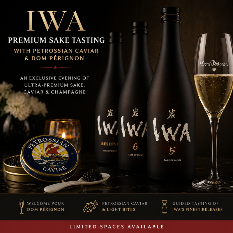 Join us for an unforgettable sake tasting experience in Los Angeles focused on IWA Sake. Begin the evening with a welcome pour of Dom Pérignon and savor the distinctive IWA sakes paired with Petrossian caviar and light bites. Bill Rieger, Ambassador for IWA Sake, will lead the tasting and guide guests through the story, craftsmanship, and vision behind this remarkable house.