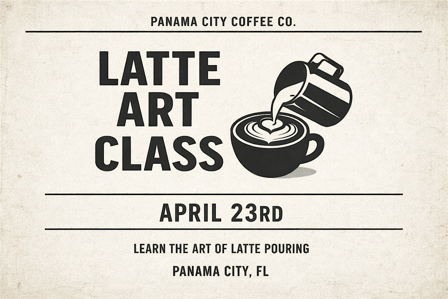 Welcome to our Latte Art Class at Panama City Coffee Co! Join us for a fun and interactive session where you'll learn how to create beautiful designs on your lattes. Our experienced baristas will guide you through the process, from steaming the milk to pouring the perfect heart or rosetta. Whether you're a coffee enthusiast or just looking to impress your friends with your latte skills, this class is perfect for all levels. Don't miss out on this opportunity to elevate your coffee game and enjoy a hands-on experience at our cozy coffee shop. See you there!