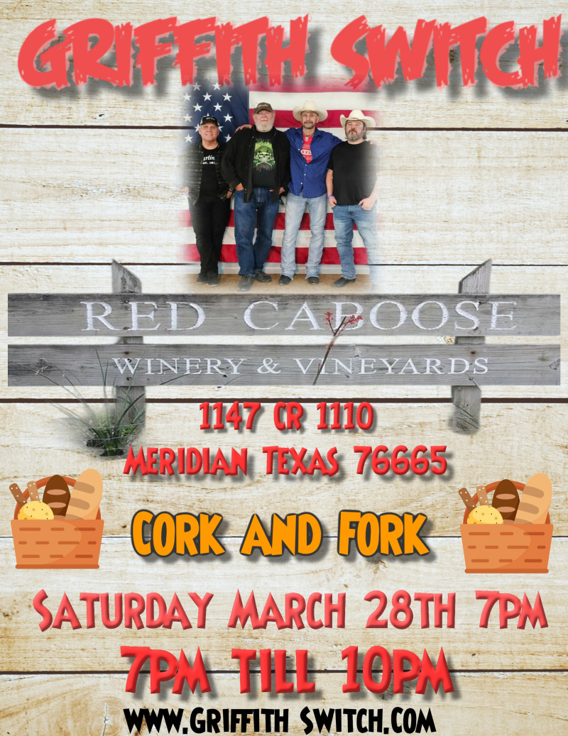 Join us for our first Cork and Fork of 2026!! We are happy to welcome back the Griffith Switch Band for this event. Their high energy blend of country, rock, and Americana will keep you singing and dancing all night long. The band will be playing live from 7-10pm. The Big Dipper food truck will be on-site with their delicious birria and other favorites. The winery will open at noon so come spend the afternoon with your Red Caboose family and then stick around for great music, great food, and great vibes!!