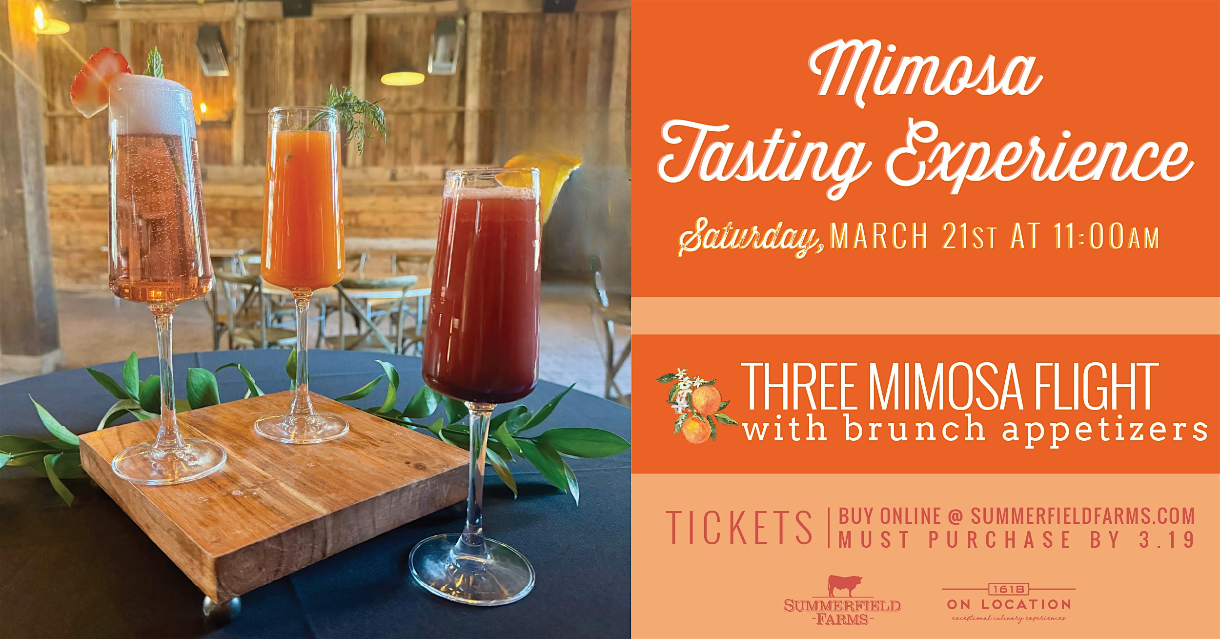 Brunch just got a bubbly upgrade! Join us at Summerfield Farms for a delightful Mimosa Tasting Experience. Sip on a flight of three uniquely crafted mimosas while indulging in perfectly paired brunch-inspired appetizers by 1618 On Location. Whether you're a mimosa enthusiast or simply looking for a fabulous way to spend your midday, this event is the ultimate treat for your taste buds. Gather your friends, raise a glass, and let’s toast to a sparkling brunch experience!