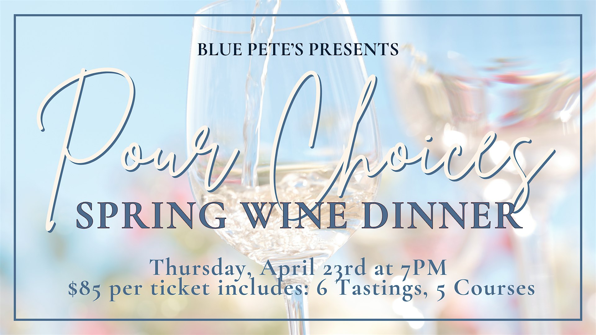 Join us for Pour Choices, a seasonally inspired wine dinner here at Blue Pete's! We will be exploring a variety of seasonal wines, each of which will be artfully paired with a chef curated menu item. Your ticket includes: