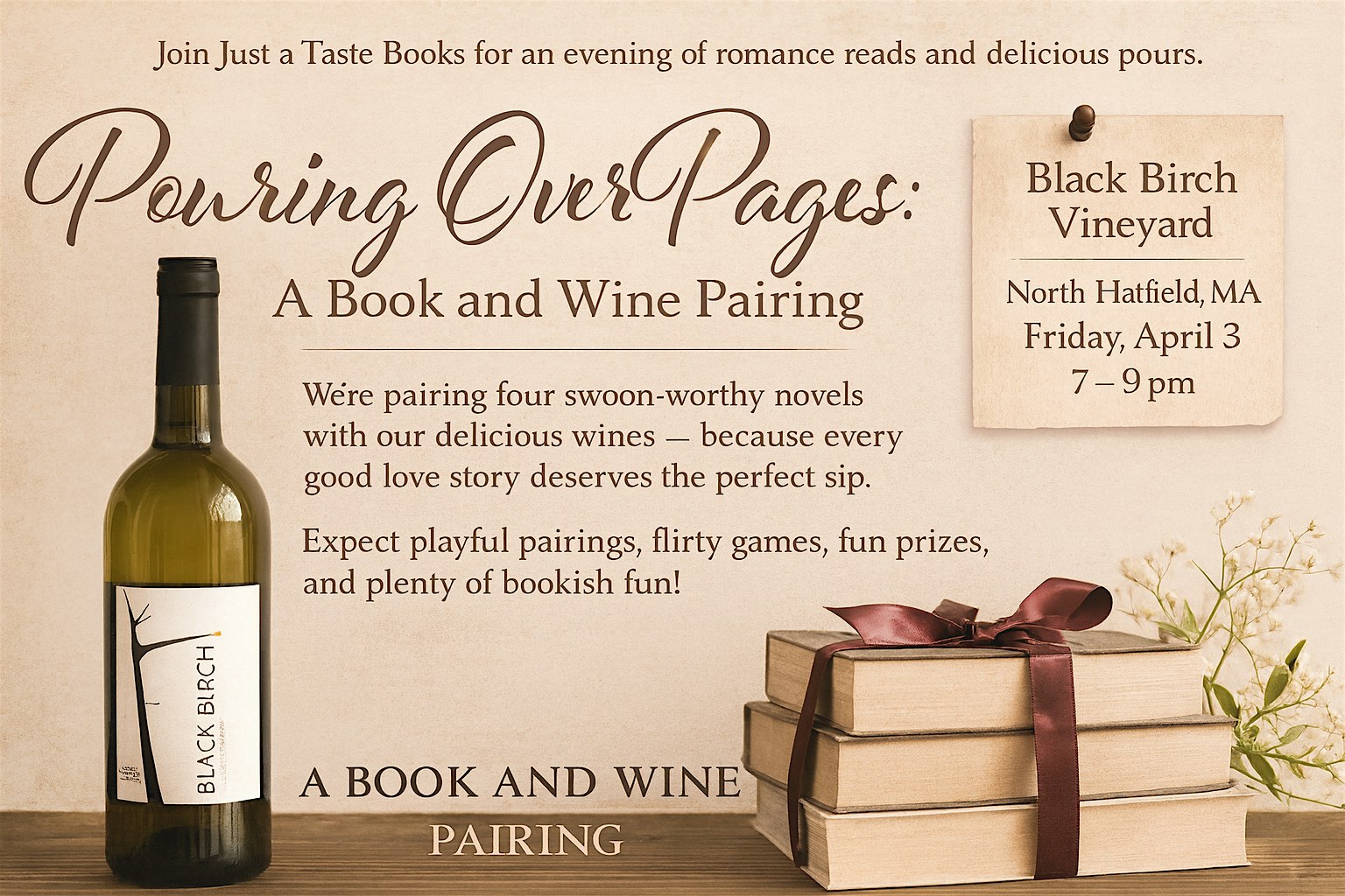 Join Just a Taste Books for an evening of romance reads and delicious pours. We’re pairing four swoon-worthy novels with our delicious wines — because every good love story deserves the perfect sip. Expect playful pairings, flirty games, fun prizes, and plenty of bookish fun!