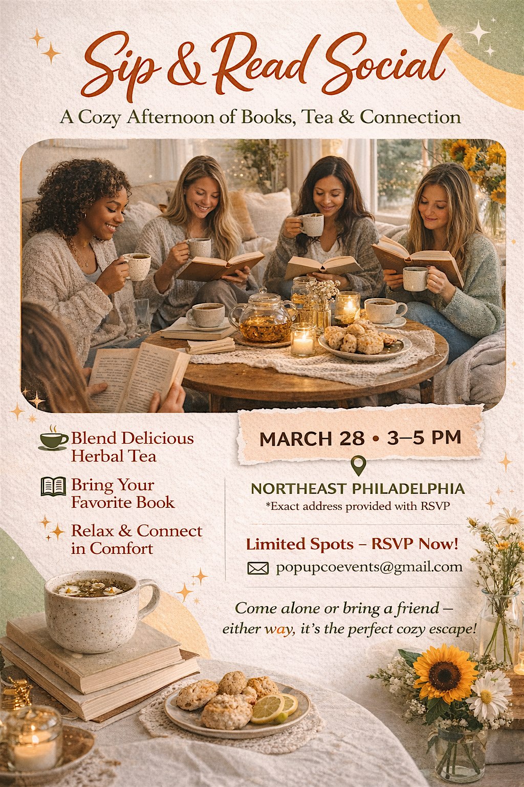Sip & Read Social is more than just an event—it’s an experience. Whether you come with a favorite book or simply want to unwind, this cozy afternoon invites you to slow down, relax, and enjoy the simple pleasures of reading and tea in good company.