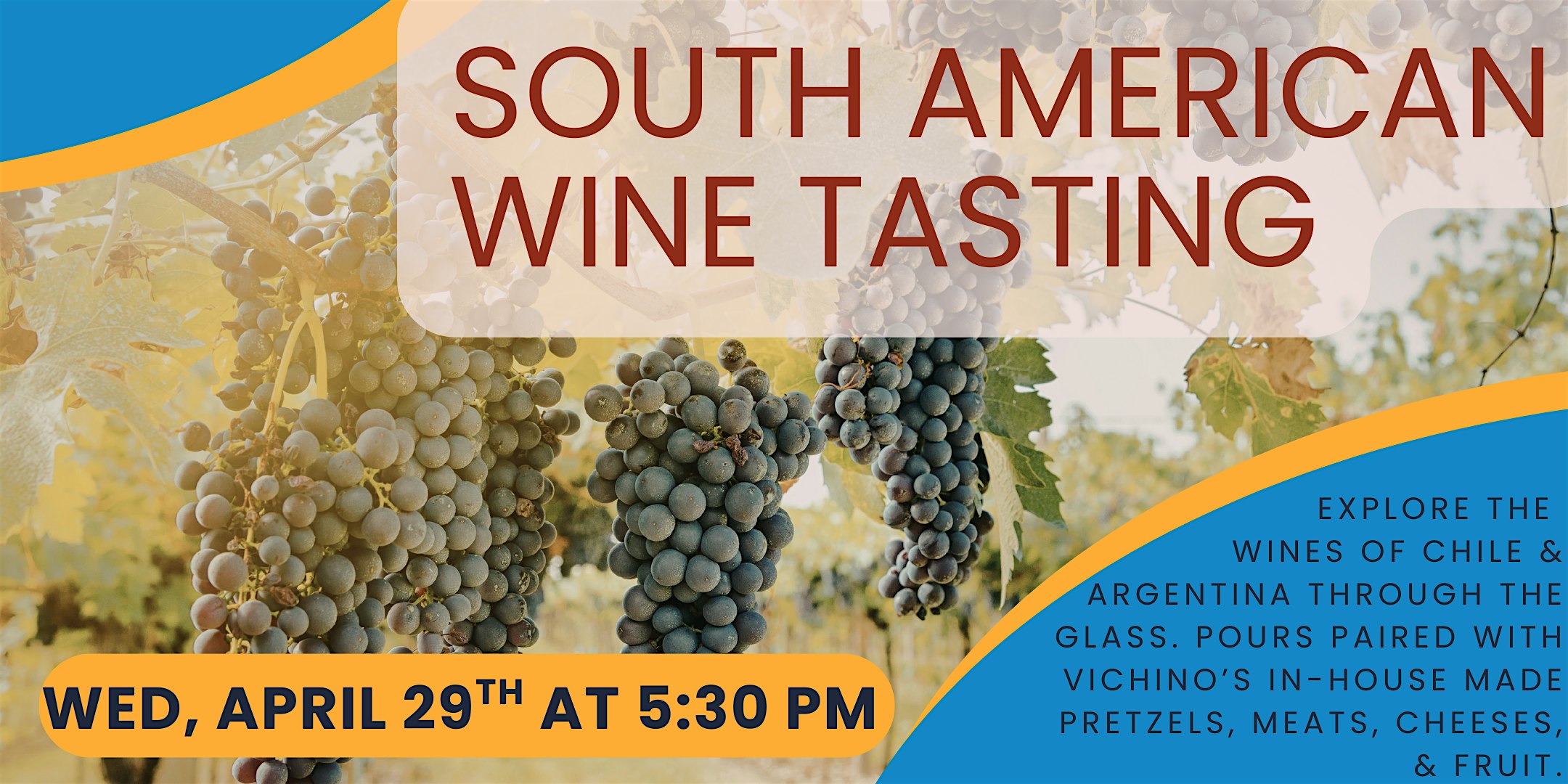 Seats are limited, so reserve early and come raise a glass with us as we discover the wines of Chile & Argentina together at Vichino’s!