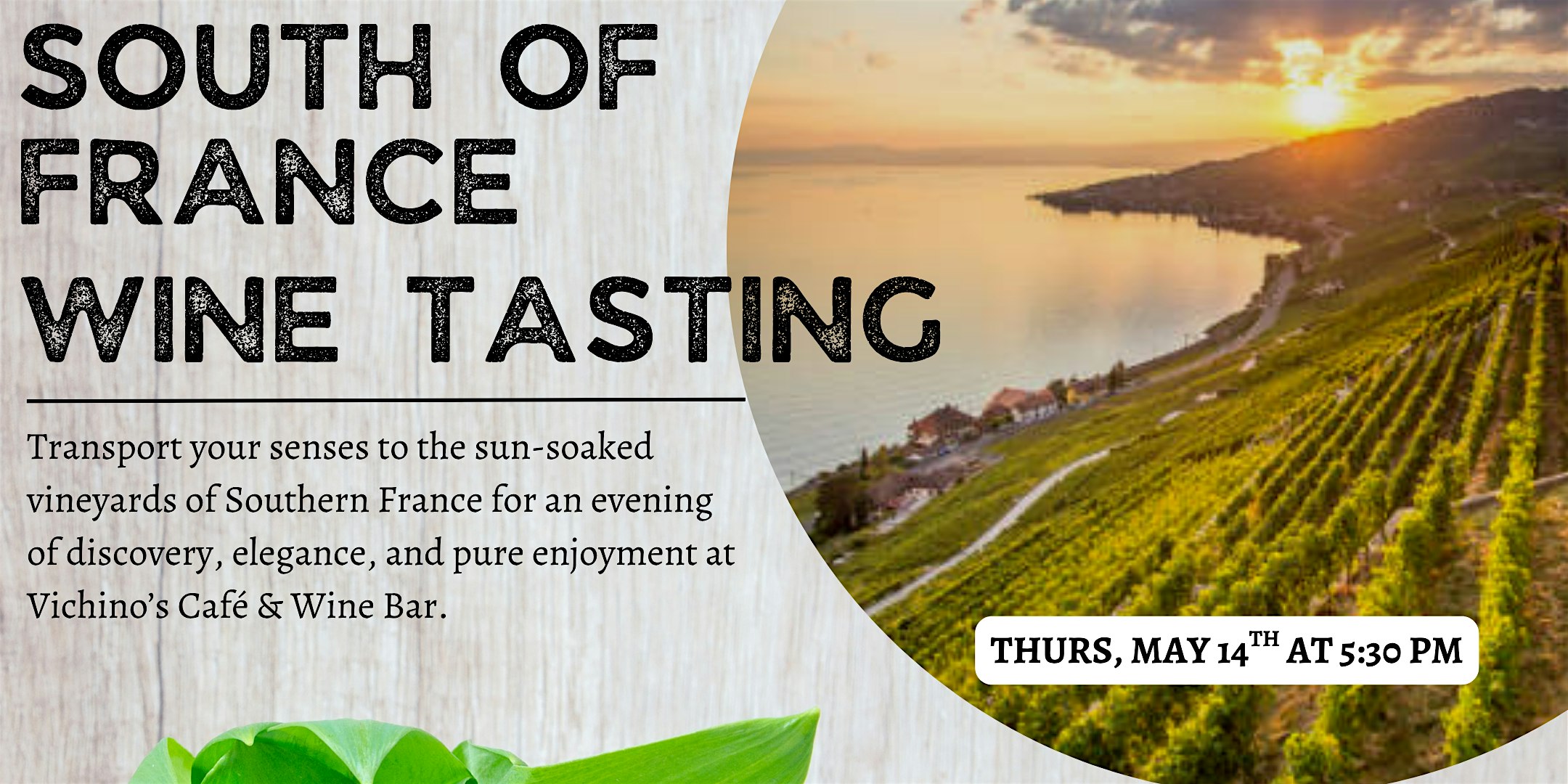 Transport your senses to the sun-soaked vineyards of Southern France for an evening of discovery, elegance, and pure enjoyment at Vichino’s Café & Wine Bar.