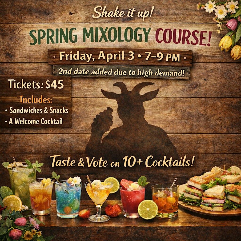 Join us to sample 10+ potential cocktails for the upcoming Spring/Summer menu and provide feedback to help us formulate the final draft! Learn about the basics of mixology while sampling tasty craft cocktails!