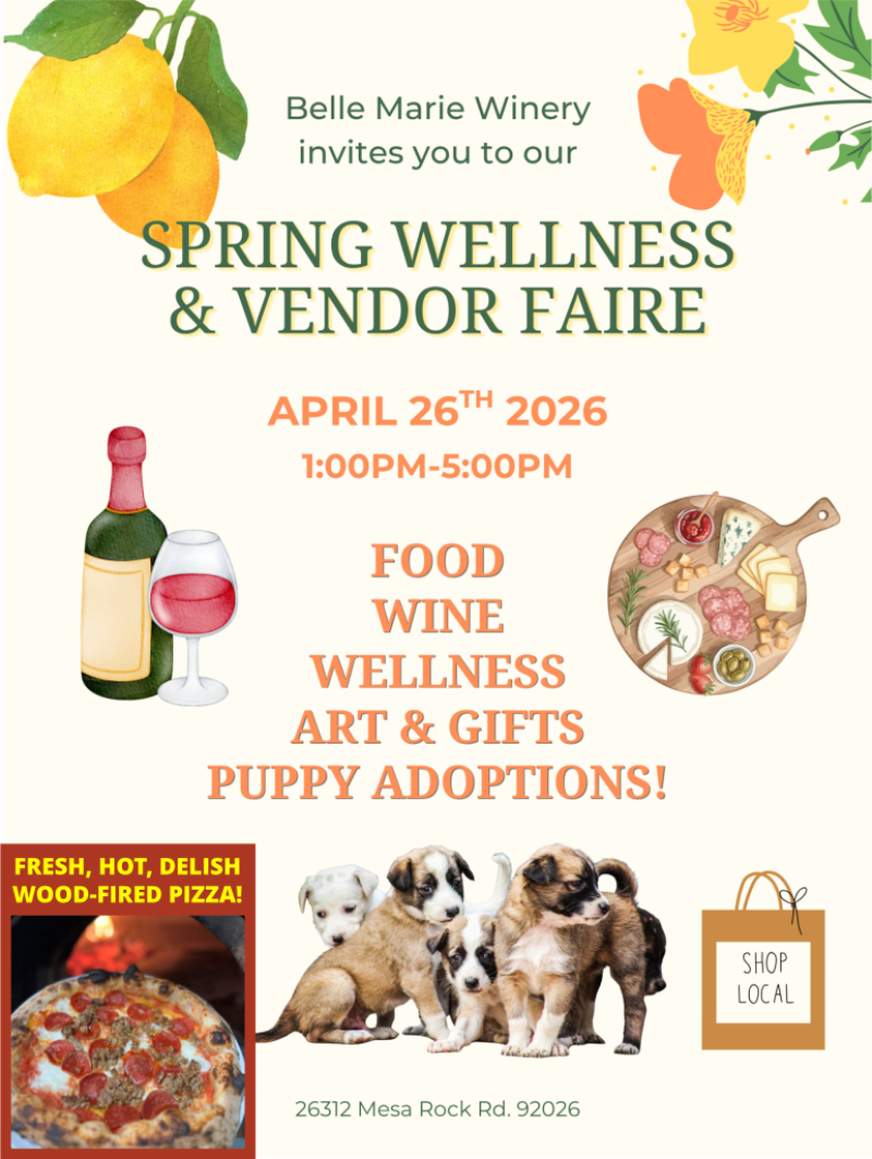 You won't want to miss our first ever Spring Wellness and Vendor Faire! Wellness booths, fitness demonstrations, food and wine, a variety of fine art and craft vendors, fun gifts (Mother's Day is right around the corner), and of course plenty of the best wines in town. And even a puppy adoption... play with these adorable pups and have your heart warmed! Admission to the festival is free and all ages are welcome. We will have fresh charcuterie and hot, delicious, wood-fired pizza available for sale, and also a fun "around the world" wine tasting tour as part of the festivities. Come join us!