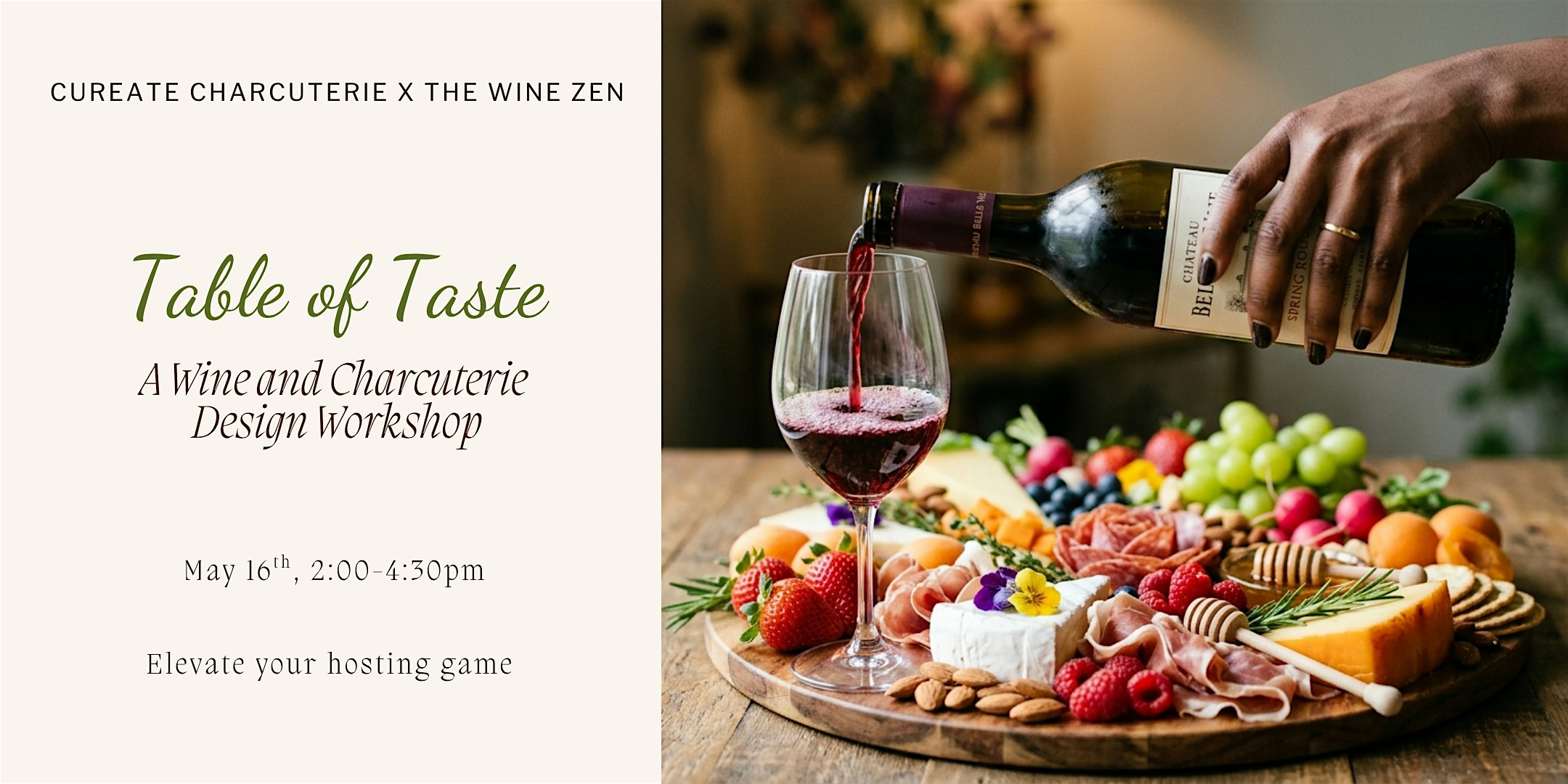Join us on May 16th from 2 to 4:30 pm for a guided wine and charcuterie experience where you will snack, sip, and style your way through a thoughtfully curated spread of cheeses, cured meats, seasonal produce, and elevated bites.