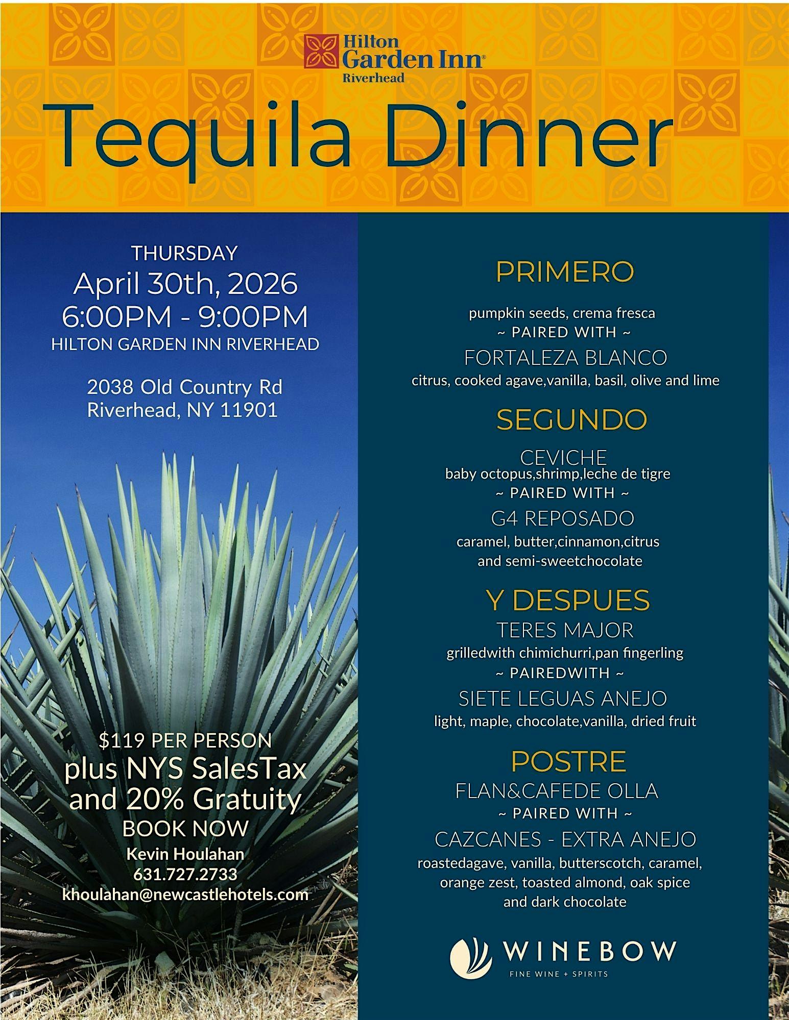 Join us for a fun and tasty evening at the Hilton Garden Inn Riverhead! On April 30, 2026 at 6:00 PM (Eastern Time), we'll dive into delicious dishes paired perfectly with smooth tequilas. It's the perfect chance to relax, enjoy great company, and savor unique flavors. Don’t miss out on this laid-back night of good food and great vibes! Special thanks to Winebow Fine Wine + Spirits for their participation.