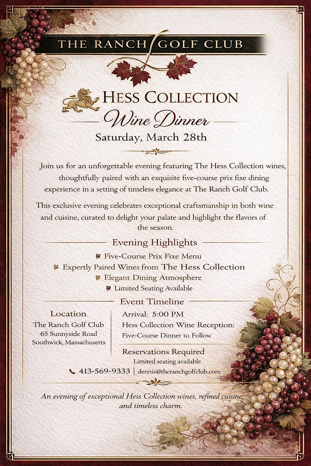 Join us for our Hess Collection Wine Dinner on Saturday, March 28th, featuring expertly paired Hess Collection wines and an exquisite five-course prix fixe menu.