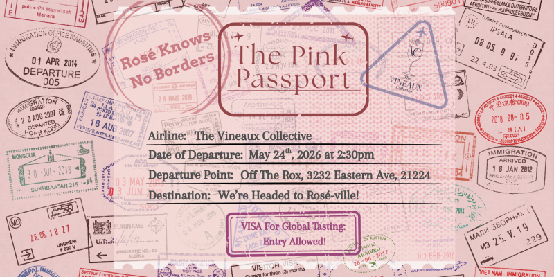 The Vineaux Collective invites you to "The Pink Passport:" a guided global rosé tasting experience at Off The Rox in Baltimore's Highlandtown neighborhood. For $55, guests will explore rosés from around the world through a curated flight paired with light bites and great conversation.