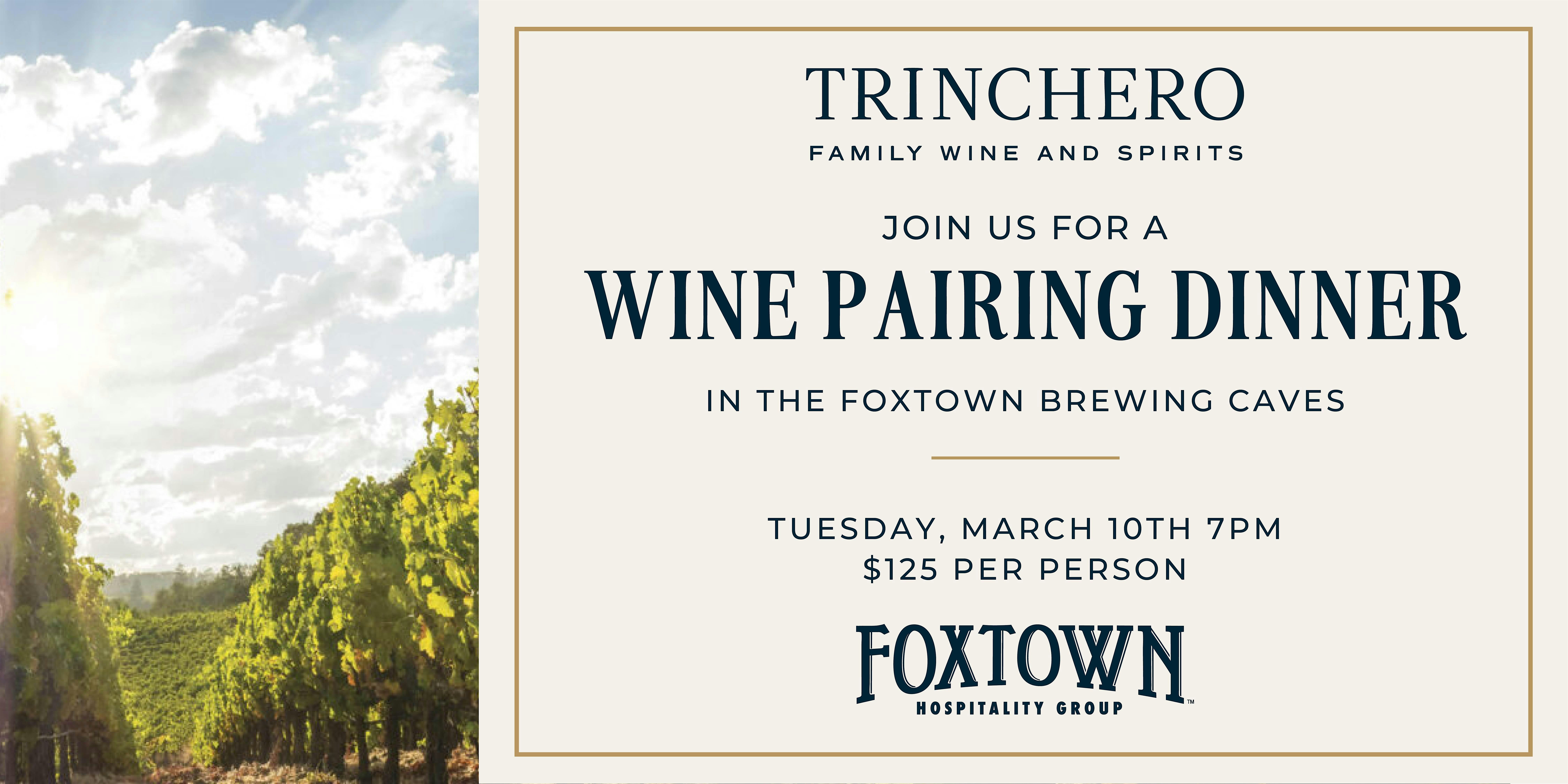 Join us for an unforgettable evening celebrating the wines of Trinchero Family Estates - set within the unforgettable ambiance of our Foxtown Brewing historic lager caves. This curated wine dinner features a multi-course menu expertly paired with Trinchero’s renowned portfolio, highlighting expressive varietals and bold flavors from California’s most celebrated regions.