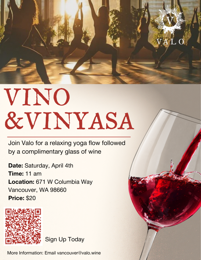Start your weekend with Vino & Vinyasa at Valo. Join us for a relaxing Vinyasa yoga flow designed for all levels in a welcoming environment. This gentle Saturday morning practice is the perfect way to stretch, breathe, and reset for the weekend.