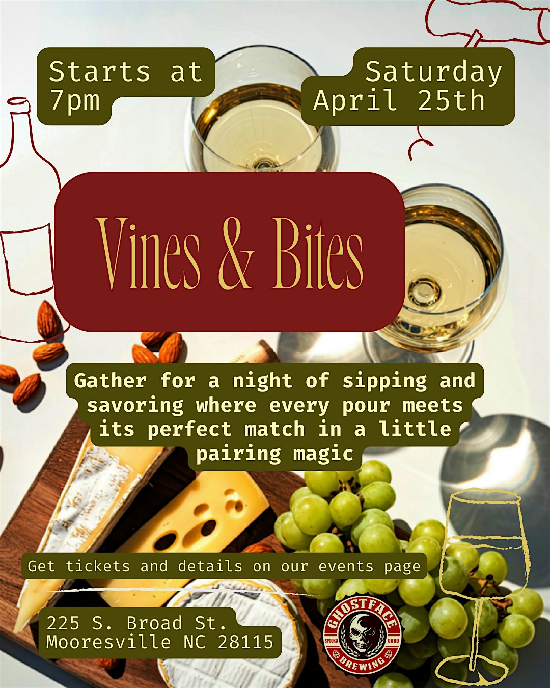 From creamy cheeses and crisp crackers to savory spreads, crunchy nuts, and fresh, seasonal fruits, each pairing is curated to highlight the character of the wine — whether bold and robust, light and refreshing, or beautifully balanced in between. As you move through the six tastings, you’ll discover how the right bite can transform each sip, bringing out hidden notes and creating delicious new flavor combinations.
