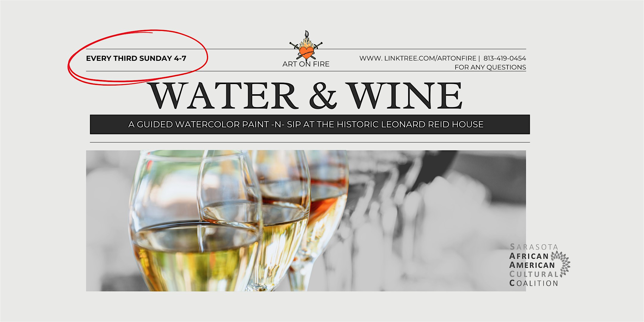 Welcome to Water & Wine at The Historic Leonard Reid House! Join us for a delightful evening of refreshing drinks in a charming setting. Sip on fine wines while receiving guided watercolor instruction by local business ART ON FIRE, led by artist Bianca Selket. Enjoy the serene ambiance of this historic venue. Whether you're a wine connoisseur, seasoned artist, novice, or simply looking to unwind with friends, this event is the perfect opportunity to relax and mingle. At the same time, enjoy contemporary work-on-view, that either highlights African American culture or is by African American artists from near and far. Don't miss out on this unique experience at The Historic Leonard Reid House!