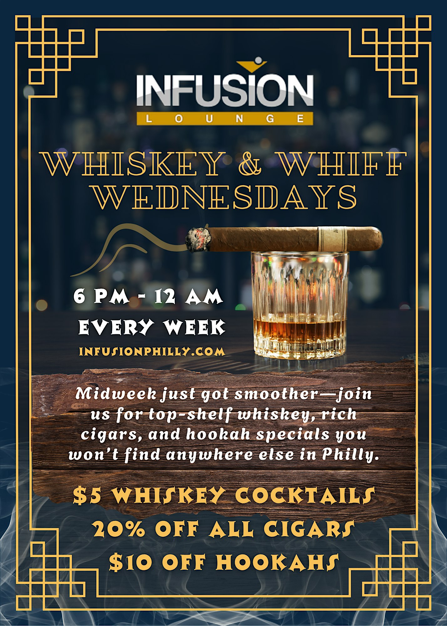 Every Wednesday at Infusion Lounge, indulge in top-shelf whiskey, rich cigars, and smooth hookah specials you won’t find anywhere else in Philly – all in a stylish, upscale lounge setting.