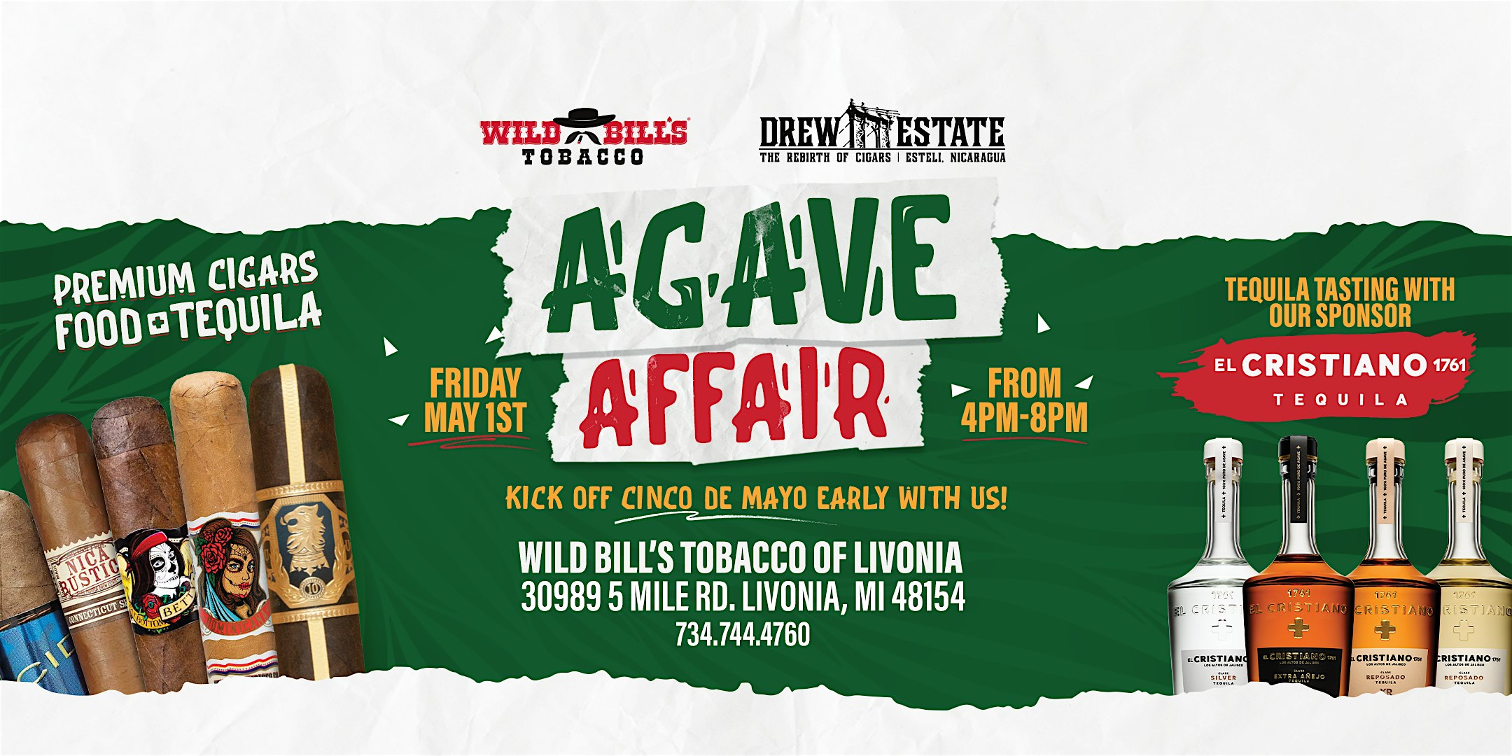 Wild Bill's Agave Affiar! Join us at Wild Bill's Tobacco in Livonia Michigan for our first Agave Affair event! This special event is a perfect way to get together and celebrate Cino de Mayo early with the wide selection of premium cigar specials from Drew Estate Cigars and Tequila Tasting with El Cristiano Tequila
