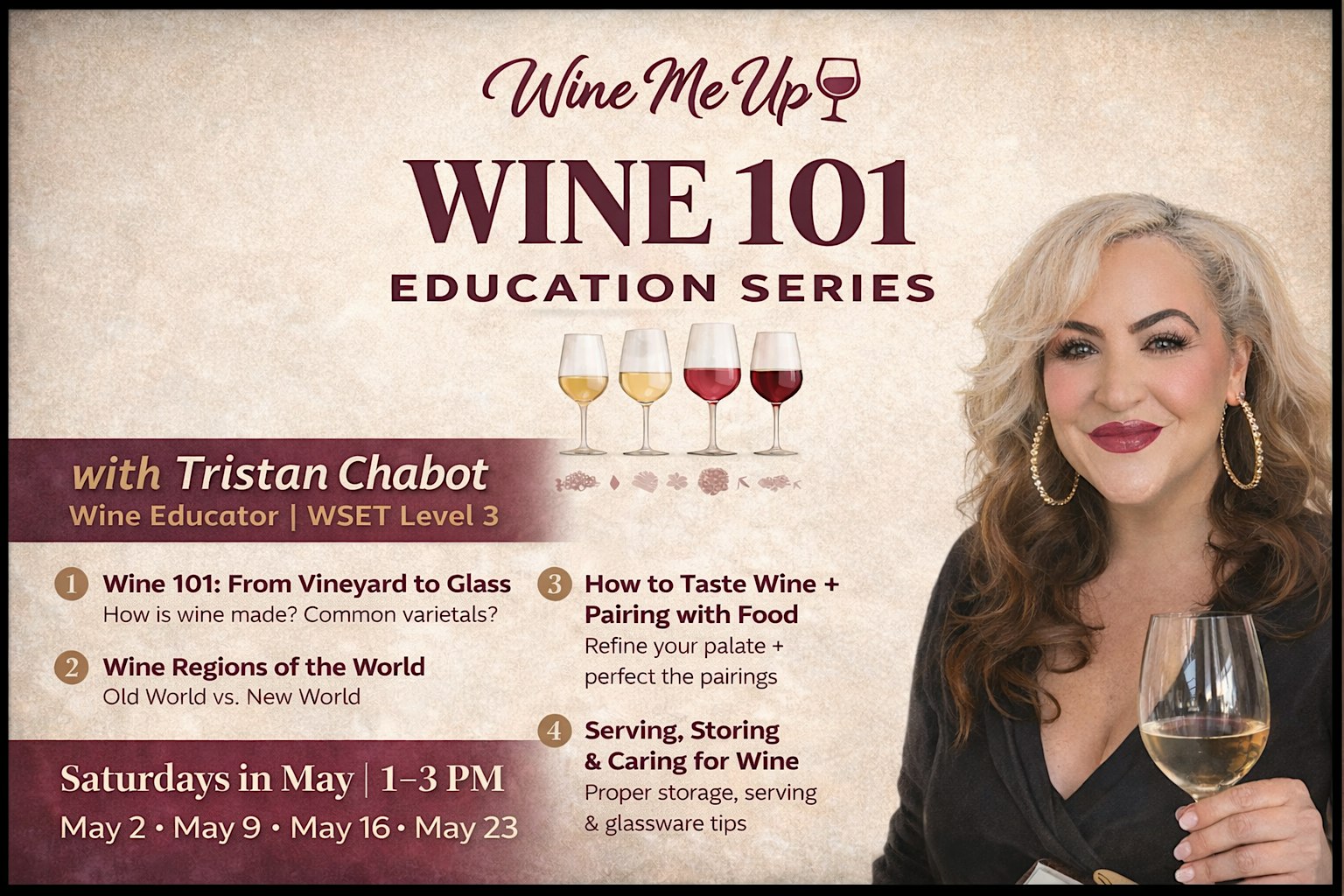 Join us at Wine Me Up for our Wine 101 Education Series led by wine educator Tristan Chabot (WSET Level 3).