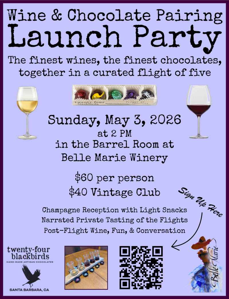 We have put together a curated flight of premium Belle Marie wines and delicious chocolate truffles from Santa Barbara's own Twenty-Four Blackbirds chocolatier.
